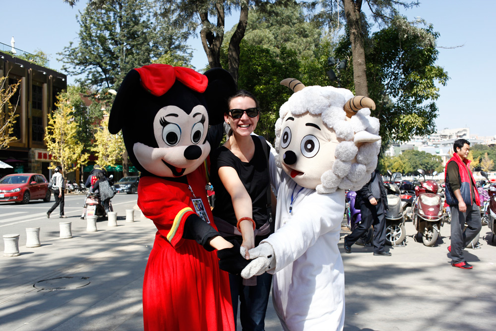 Jenia having some fun with Minnie and Pleasant Goat in Kunming, China.